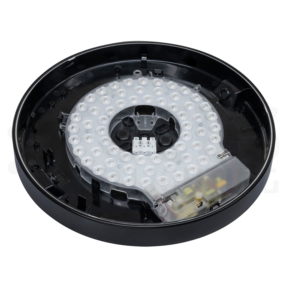 De Evo LED plafonnière combineert strak design met maximale flexibiliteit. Het armatuur heeft een zwarte behuizing en een ruime omvang van Ø335x63mm. Met drie instelbare vermogens (8W/12W/15W) en drie kleurtemperaturen (3000K/4000K/6000K), in combinatie met een flash-free driver, is het armatuur geschikt voor uiteenlopende toepassingen. De hoogwaardige leds bieden een natuurgetrouwe kleurweergave (CRI>95) en een lichtopbrengst tot 90 lm/W. De robuuste polycarbonaat behuizing (IK10) en IP54- classificatie maken het armatuur slagvast, stof- en spatwaterdicht. De opalen diffuser straalt egaal licht in een brede stralingshoek van 120°. De deels doorlopende opalen afscherming zorgt voor subtiele verlichting van de rand. Kabelinvoer is eenvoudig door de voorgemonteerde rubberen insteekgaten aan de zij en achterkant van het armatuur.